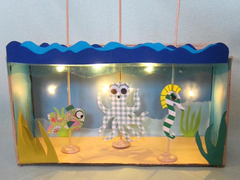 Byg dit eget magiske vinter-dukketeater ud af en skotøjsæske! Det kan blive alt fra et smukt is-landskab til en sjov kælkebakke eller en snedækket skov. Alle kasser får lys, så de kan bruges både som dukketeater og som smukke lyskasser – og selvfølgelig får du dit eget med hjem.